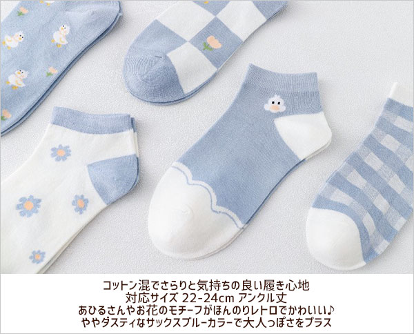 な あひるさんや、 どこか懐かしい レトロ調のお花モチーフがキュートな アンクル丈のコットン混ソックス ちょっぴりダスティなブルーカラーの5柄展開、 22-24cm対応のレディスサイズです。