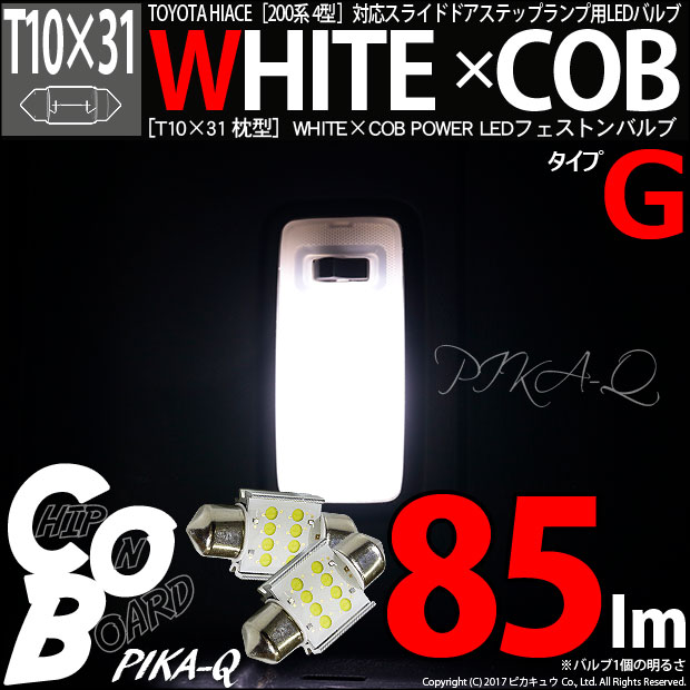 [画像車両:TOYOTA HIACE 型式:CBF-TRH200V 平成27年7月登録車両 LEDヘッドランプ装着車] 商品仕様 商品名 TOYOTA HIACE[200系 4型]対応 スライドドアステップランプ用LEDバルブ T10×31 WHITE×COB POWER LED FESTOON BULB [Type-G] 全光束85ルーメン LEDカラー:ホワイト6600K 入数:2個 仕様 DC12V車専用[HV車・EV車対応] 規格 T10×31 サイズ 全長:29mm/幅:14mm/厚み:8mm/両口金:Φ8.9mm ※純正T10×31白熱球サイズ 全長:31mm/両口金:Φ8.5mm LEDカラー ホワイト 色温度 6600ケルビン(K) 明るさ 85ルーメン(lm)※ルーメン値は、バルブ1個の値を示しています。