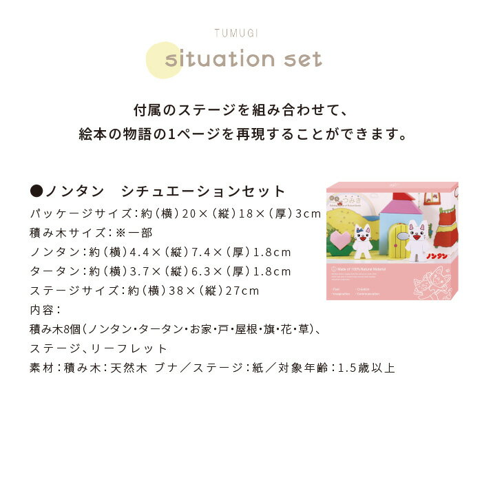パッケージサイズ 約(横)20×(縦)18×(厚さ)3cm 積み木サイズ ノンタン:約(横)4.4×(縦)7.4×(厚さ)1.8cm タータン:約(横)3.7×(縦)6.3×(厚さ)1.8cm ステージサイズ 約(横)38×(縦)27cm 内容 積み木8個 (ノンタン・タータン・お家・ 戸・屋根・旗・花・草)、 ステージ、リーフレット 素材 積み木:天然木 ブナ ステージ:紙 対象年齢 1.5歳以上 「絵本のつみき」は、積み木遊び、 ごっこ遊び、知育遊びと、 成長に合わせた遊びと学びが得られます。
