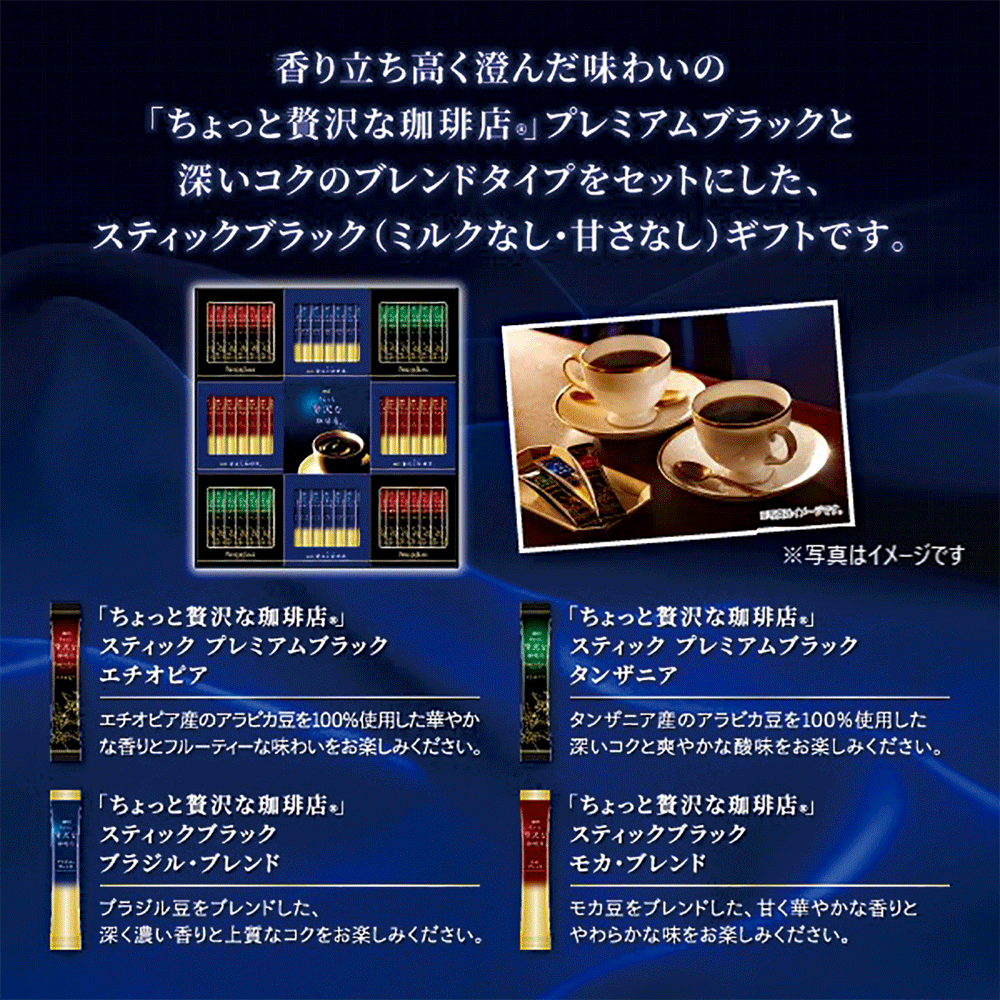 香り立ち高く澄んだ味わいの「ちょっと贅沢な珈琲店」プレミアムブラックと深いコクのブレンドタイプをセットにした、スティックブラックギフトです。